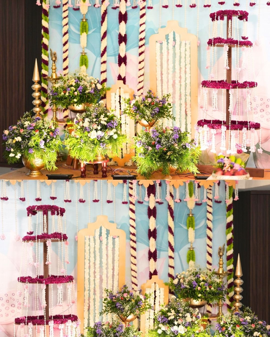 Exquisite floral wedding backdrop with handcrafted garlands, royal seating, and decorative arrangements for a picture-perfect stage