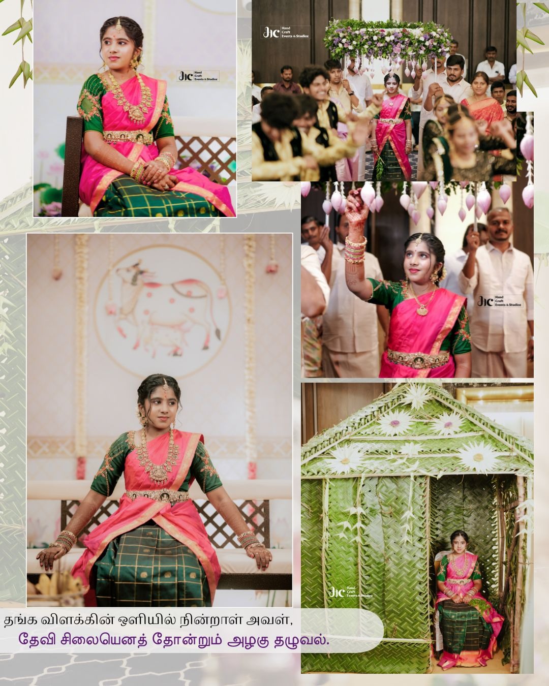 Beneath a canopy of blooms and grace, Tradition found its perfect place. Petals whispered blessings bright, As lamps and smiles adorned the light. A garden of joy, serene and pure, Where culture and love forever endure. Each hue, a story softly told — Of a girl’s new journey, bright and bold. 🌸 The stage setup is adorned with pastel backdrops, delicate pink floral elements, and traditional gold accents, creating a divine and graceful atmosphere. A green leaf hut structure adds a touch of authentic South Indian tradition, symbolizing prosperity and purity. The arrangements of flowers and fruits around the stage enhance the ceremonial vibe, while the intricate detailing shows the care and craftsmanship behind every element. The floral arch under which the young girl enters adds a royal and celebratory charm. Overall, the decor captures the essence of a joyful milestone celebration — soft, spiritual, and full of vibrant energy✨️