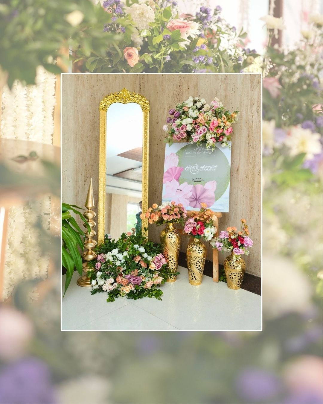 பொற்கண்ணாடி சாட்சியாக, மலர்மாலை மணம் பரப்பும் கனவுக் கோல அலங்காரம். 🌸✨